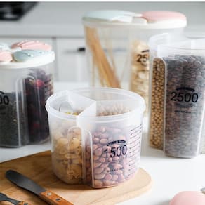 Pote com Divisórias para Armazenamento de Alimentos – 1.500 ml Praticidade e organização na sua cozinha: Guarde arroz, feijão, macarrão, café, açúcar e muito mais em um único pote. Design inteligente: Dividido em 3 compartimentos, permite armazenar diferentes alimentos de forma prática, eliminando a bagunça e facilitando a rotina na preparação das refeições. Alta capacidade: Com 1.500 ml, é ideal para manter alimentos organizados e bem conservados por até um mês. Material seguro e resistente: Produzido em plástico transparente livre de BPA, não libera toxinas e garante maior durabilidade. Especificações Técnicas: Capacidade: 1.500 ml Altura: 14 cm Diâmetro: 13 cm Material: Plástico transparente livre de BPA Imagem meramente ilustrativa. Marca: Não Informado