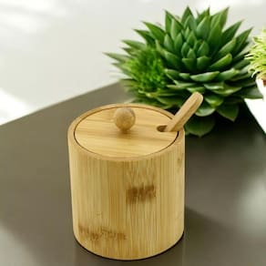 Detalhes do produto: - Acompanha: 1 pote com tampa + 1 colher - Material: Bambu - Dimensões: Pote - 8cm de diâmetro x 8cm de altura Colher - 13cm - Capacidade: 200ml