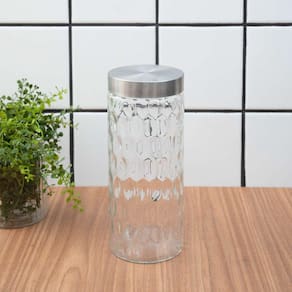 Esse é o pote bolhas 2200ml de vidro com tampa inox redondo da MOZCADA. Versátil: para armazenar alimentos, pregadores de roupa, decoração festiva, flores secas, fios e o que mais você quiser guardar.Aço inoxidável: durável, higiênico e não enferruja.Design decorativo: funcional e bonito, com textura de bolhas no vidro.Dimensões do produto:Altura - 27cmLargura - 11cm