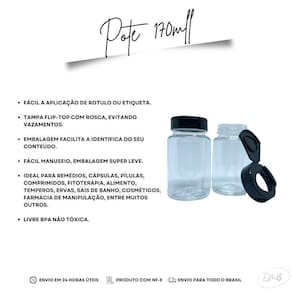 Os 50 Potes 170Ml Plástico Pet Rígido Com Tampa Preta Flip Top são ideais para armazenar remédios, cápsulas, pílulas, comprimidos, fitoterapia, alimentos, temperos, ervas, sais de banho, cosméticos e muito mais. Sua capacidade de 170g oferece espaço suficiente para organizar seus itens de forma prática e funcional.