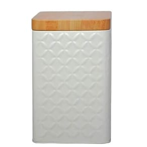 Características: Cor: Branco e amadeirado Material: Metal Largura: 10cm Comprimento: 10cm Altura: 17,5cm Tampa: Material da Tampa é metal que imita bambu, para que a vedação seja mais eficiente.