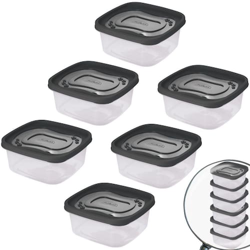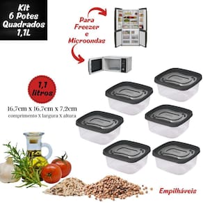 Conjunto com 6 potes plásticos quadrados com tampa. Têm capacidade para 1,1 litros. São produzidos em polipropileno de alta resistência e durabilidade e material atóxico livre de bisfenol (BPA Free). Podem ser levados ao freezer e micro-ondas.