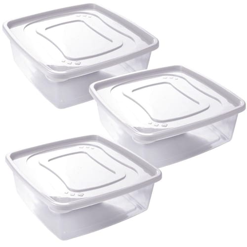 Conjunto com 3 potes de plástico quadrados com tampa, sendo cada um com capacidade para 6,6 litros. São produzidos em polipropileno de alta resistência e durabilidade e material atóxico livre de bisfenol (BPA Free). Podem ser levados ao freezer e micro-ondas.