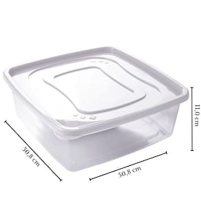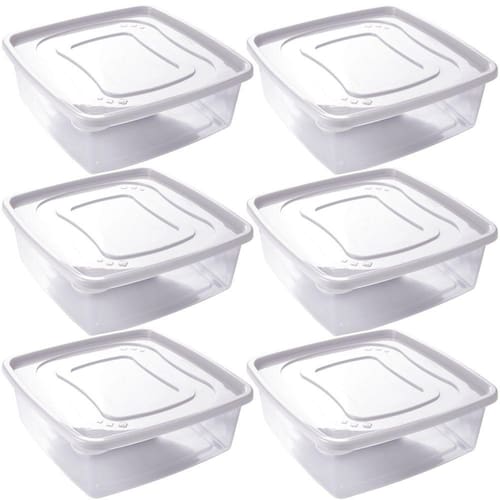 Conjunto com 6 potes de plástico quadrados com tampa, sendo cada um com capacidade para 6,6 litros. São produzidos em polipropileno de alta resistência e durabilidade e material atóxico livre de bisfenol (BPA Free). Podem ser levados ao freezer e micro-ondas.