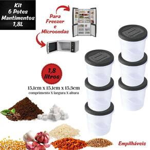 Conjunto com 6 potes de plástico redondos altos com tampa de rosca, sendo cada um com capacidade para 1,8 litros. São produzidos em polipropileno de alta resistência e durabilidade e material atóxico livre de bisfenol (BPA Free). Podem ser levados ao freezer e micro-ondas. Material: polipropileno Capacidade: 1,8 litros Comprimento: 15 cm / Largura: 15 cm / Altura: 15 cm