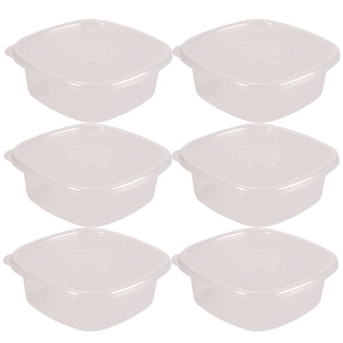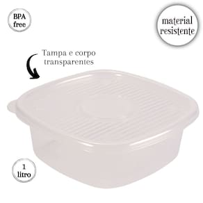Conjunto com 6 unidades. Recipiente plástico com capacidade para 1 litro. Possui tampa translúcida para facilitar a identificação do conteúdo. É produzido em material atóxico e livre de BPA. Pode ser levado ao freezer e ao micro-ondas. Material: polipropileno Capacidade: 1 litro Comprimento: 18,1 cm / Largura: 18,1 cm / Altura: 6,6 cm