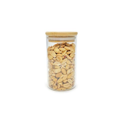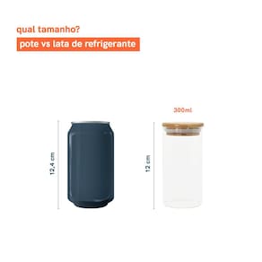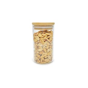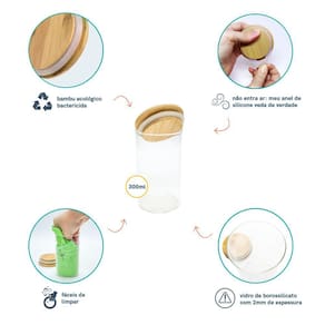 Esse é o pote de vidro hermético redondo de 300ml para mantimentos com tampa de bambu da OIKOS.