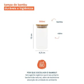 Não julgue pelas aparências, ele não é só um potinho bonito: com a combinação da vedação de silicone e o bambu antibactericida, esse pote se torna um verdadeiro mestre na conservação de alimentos! E não é só de comida que vive esse pote: além de temperos, sal e açúcar, nele cabe sementes, joias, curativos, grampos, elásticos e outras pequenices que você quiser guardar - isso que é versatilidade.
