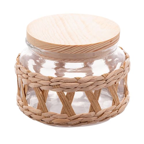 Dimensões compr. X larg. X alt. : 10,5 x 10,5 x 8,0 cm Material: vidro e sisal, tampa madeira Capacidade: 350 ml