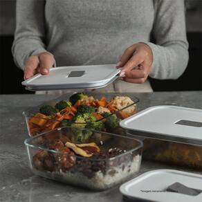 O pote de vidro hermético da Linha Fresh Lock acompanha você em todas as etapas no preparo das refeições, suportando temperaturas de até 220°C no forno ou air fryer e -20°C no freezer. Feito de material que evita manchas e odores, é a uma escolha durável e segura para armazenar alimentos. Proporciona uma jornada completa desde o preparo até o armazenamento facilitando seu dia a dia na cozinha