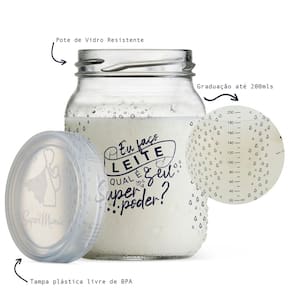 Armazene e conserve o leite materno com segurança e estilo com o nosso conjunto de Potes de Vidro para Leite Materno de 200ml. Cada pacote contém três unidades, todas decoradas com a frase inspiradora "Eu faço Leite, qual é o seu super poder?", tornando a experiência de alimentação do seu bebê ainda mais especial.
