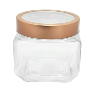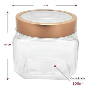 - Capacidade: 800ml - Tampa rosqueável com visor transparente - Cor cobre - Dimensões: 11x11,5cm largura x altura - Composição vidro