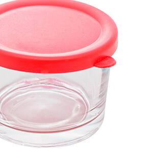 A tigelas em vidro da Lyor possui tampa de plástico na cor vermelha. Com 200mL de capacidade os potes são ideais para armazenar diversos tipos de alimentos e condimentos. Possui 5,5cm de altura e 8cm de diâmetro.