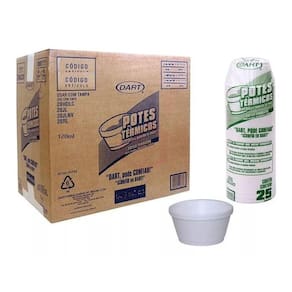 1000 potes de isopor térmico 120ml - dart 1 caixaPotes térmicos para alimentos podem ser pré-embalados ou usados no momento de servir sorvetes, mousse, massas, salada de frutas, sobremesas, caldos, feijoada e mais.Descrição:Cor: brancoMaterial: isoporDimensões: 120 mlQuantidade: 100 unidades - 1 caixa 40 pacotes com 25 em cada Diâmetro do tope cm : 6.12Diâmetro da base cm :4,31Altura cm :4,80Usar tampa: 12jlMarca: dart