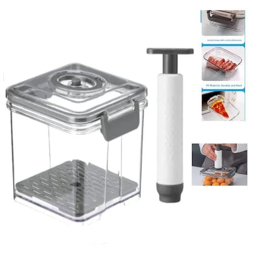 Principais Benefícios: - Conservação prolongada com vedação a vácuo - Bomba manual inclusa para rápida remoção do ar - Material resistente e livre de BPA - Corpo transparente para fácil visualização - Tampa com trava lateral à prova de vazamentos - Formato retangular e empilhável, ideal para otimizar espaço