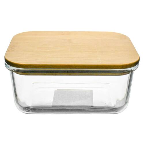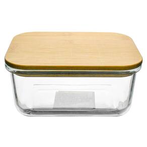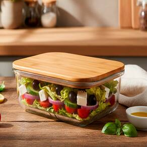 Seu corpo retangular facilita a organização e o empilhamento, enquanto a tampa em bambu adiciona um toque natural e elegante, garantindo vedação segura.