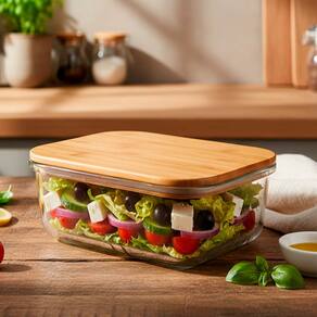 Seu corpo retangular facilita a organização e o empilhamento, enquanto a tampa em bambu proporciona fechamento seguro e um toque sofisticado ao design.