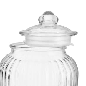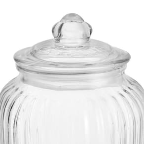 Feito de vidro, possui formato arredondado com detalhes em relevo, tampa com puxador em vidro e fechamento hermético. Sua estrutura transparente permite a conservação dos alimentos e facilita a identificação rápida do conteúdo armazenado.