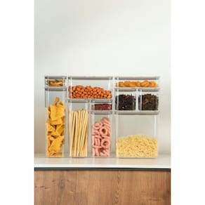 Seu sistema de encaixe não apenas otimiza espaço, mas também proporciona versatilidade, com inúmeras opções de empilhamento, seja de potes maiores sobre os menores ou retangulares acima dos quadrados e vice-versa. A vedação hermética impede vazamentos e a entrada de ar, mantendo frescor e qualidade.