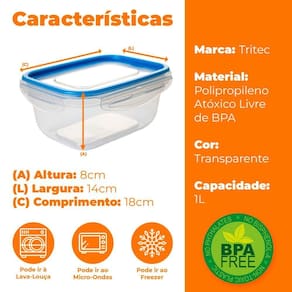 Com dimensões de 18cm de comprimento, 14cm de largura e 8cm de altura, o pote Tritec oferece o espaço ideal para guardar uma variedade de alimentos e pode ser empilhado, otimizando o espaço da sua geladeira, freezer ou armários.
