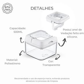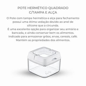 O Pote com tampa hermética e alça para fechamento possui uma ótima vedação devido ao anel desilicone que a circunda.É uma excelente opção para organizar seu armário e bancada, e ainda conservar bem os alimentos.Indicado para armazenar grãos, ervas, cereais, café.Mantém as propriedades dos alimentos.Não contém bpa.Também pode ser utilizado no armazenamento de outros objetos;Fácil de lavar, material resistente e sua transparência facilita identificação do conteúdo.