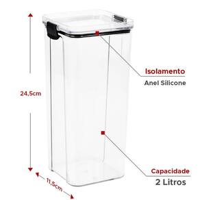 - Capacidade 2 Litros - Pode ser empilhado, Tampa com Sistema de Empilhamento - Isolamento em Silicone com Travas - Dimensões 24,5 x 11,5 altura x largura