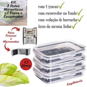 Conjunto com 3 potes plásticos com capacidade para 1,1 litros. Possuem silicone na tampa e travas laterais para uma melhor vedação e conservação do alimento. Seu escorredor inferior mantém os alimentos longe do contato com resíduos que podem se formar no fundo. Produzido em material atóxico, pode ser utilizado no freezer e no micro-ondas.