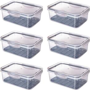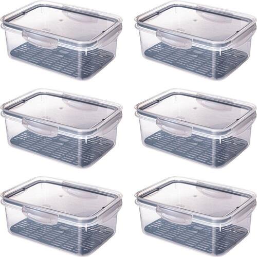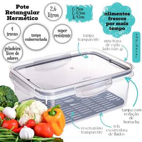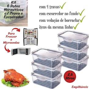 Conjunto com 6 potes plásticos com capacidade para 2,6 litros. Possuem silicone na tampa e travas laterais para uma melhor vedação e conservação do alimento. Seu escorredor inferior mantém os alimentos longe do contato com resíduos que podem se formar no fundo. Produzido em material atóxico, pode ser utilizado no freezer e no micro-ondas.
