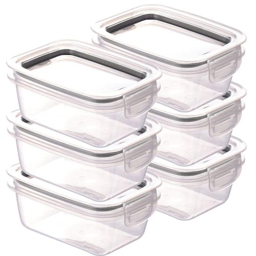 Kit com 6 potes plásticos com capacidade para 910ml. Possui silicone na tampa e travas laterais para uma melhor vedação e conservação do alimento. Produzido em material atóxico, pode ser utilizado no freezer e no micro-ondas.