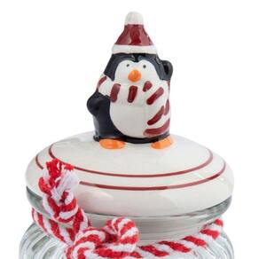 O Natal é uma das comemorações mais especiais do ano! E para desfrutar o clima natalino, utilize o Pote Pinguin para armazenar doces ou biscoitos decorativos e tenha uma ceia memorável. Fabricado em vidro e tampa em cerâmica, possui um lindo enfeite de pinguin e laço para encantar todos os seus convidados.