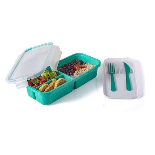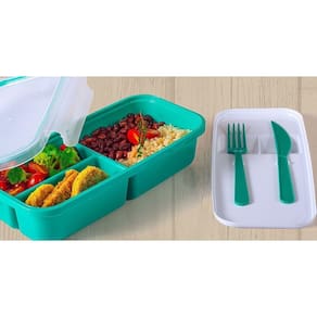 Pote marmita 1,2L, leve, versátil, de fácil utilização, conta com sistema de 4 travas, vedação hermética com silicone, 3 divisórias e pode ser usado em microondas. (Acompanha talheres em polipropileno) Material: Prolipropileno e silicone Dimensões: 29cm x 15cm x 6cm Peso: 0,230kg