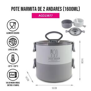 Agora ficou mais fácil organizar seus alimentos para um dia longo. A marmita de 1400 ml possui 2 recipientes que encaixa um em cima do outro, acompanha garfo e é prático e simples. Feito de material polipropileno, é resistente e possui tampa com travas para segurança evitando acidentes. Produto livre de BPA com qualidade Jacki Design. Conheça a linha completa da coleção JOY e complete o seu kit! (INSTRUÇÕES DE USO: Retire a tampa antes de levar ao micro-ondas; usar somente para aquecer comida, não para cozinhar; Vai ao freezer e lava-louças; Temperatura de uso: -20C ~120C; Limpe usando uma esponja macia e detergente.)