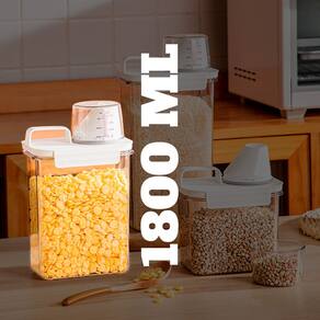 Capacidade: 1800 ML Vedação: Tampa com 2 travas herméticas Acessórios: Copo medidor acoplado na tampa Bico Dosador: Sim Alça para transporte: Sim Material: Plástico resistente, livre de BPA Uso indicado: Grãos, cereais, rações, farinha, açúcar, café, entre outros