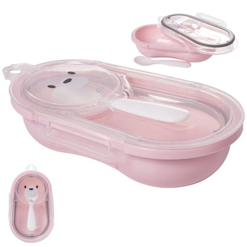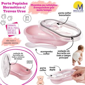 Porta Papinha Hermético Rosa com tampa incolor e vedação de borracha, porta colher e trava dupla nas laterais, com decoração infantil lúdica de urso e uma colher.