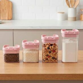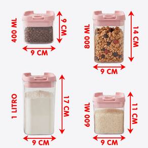 Este conjunto de 4 potes herméticos quadrados é ideal para armazenar mantimentos como arroz, feijão, açúcar, café, macarrão, cereais, snacks e muito mais
