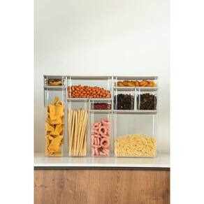 Seu sistema de encaixe não apenas otimiza espaço, mas também proporciona versatilidade, com inúmeras opções de empilhamento, seja de potes maiores sobre os menores ou retangulares acima dos quadrados e vice-versa.