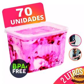 Com medidas de 11,5cm de altura, 19,5cm de comprimento e 13,5cm de largura, este pote é prático de usar e possui alça para facilitar o transporte. Sua embalagem contém 70 unidades, oferecendo um ótimo custo-benefício.
