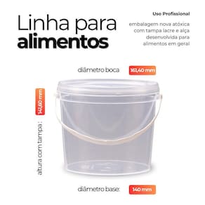 Balde transparente 2.2 litros com tampa lacre de segurança 100% bpa free - 15 peças Comercializamos o balde vazio e sem impressão O titulo e o rótulo serve apenas como sugestão de usabilidade Setor alimentício, químico e diversos. Multiuso - embalagens com boa resistência em baixas e altas temperaturas e aprovadas para contato com alimentos. - balde plásticos rígidos desenvolvidos e fabricados especificamente para a indústria alimenticia, quimica e farmaceutica - as tampas tem ótimo fechamento e são de fácil colocação, seu desenho permite um empilhamento seguro Todos os processos são feitos em sintonia com as suas exigências, tanto de segurança, durabilidade e estética. Nesta compra voce vai receber: 15 x baldes transparentes com alça plástica com capacidade de 2.2 litros 15 x tampas plastica transparente com lacre de segurança Balde: Diâmetro interno superior 156.50 mm Diâmetro interno inferior 137 mm Diâmetro externo superior 161.40 mm Diâmetro externo inferior 140 mm Diâmetro externo máximo 166.40 mm Altura interna 136 mm Altura externa 140 mm Altura com a tampa 141.60 mm Espessura média lateral 0.75 mm Espessura média no fundo 0.80 mm Peso 71 gramas Tampa: Diâmetro externo 169 mm Altura 15.20 mm Espessura média de parede 0.75 mm Peso 23 gramas Material pp Alça: Comprimento: 350 mm Espessura media parede: 0,85 mm O balde transparente de 2.2 litros para alimento com tampa lacre é um recipiente projetado para armazenar alimentos em grandes quantidades. Ele é fabricado em plástico resistente, pp polipropileno de alta densidade, que é seguro para o contato com alimentos. A forma redonda do balde permite que ele seja empilhado facilmente, o que economiza espaço no armazenamento. O tamanho de 2.2 litros é adequado para armazenar alimentos em grande quantidade, tornando-o uma opção popular para uso comercial em restaurantes, padarias, indústrias alimentícias, entre outros. Seu volume real abaixo da tampa é de 2.5 litros podendo chegar em 2.6 litros sem tampa até a borda do balde. A tampa lacre é uma característica importante deste balde, pois mantém o conteúdo fresco e protegido de contaminantes externos. Possui um sistema de encaixe que proporciona um fechamento seguro e hermético, impedindo a entrada de ar, poeira, insetos e outros elementos que possam prejudicar a qualidade do alimento. Além disso, o balde de 2.2 litros transparente possui uma tampa com lacre de segurança que é facilmente higienizável, podendo ser lavado com água e sabão e diversas vezes. Isso o torna uma opção econômica e sustentável para o armazenamento de alimentos. Alguns dos principais benefícios do balde 2.2 litros transparente para alimento com tampa lacre incluem: - alta capacidade de armazenamento: com capacidade de 2.2 litros, este balde é ideal para armazenar grandes quantidades de alimentos. - proteção contra contaminação: a tampa com lacre de segurança é uma barreira eficaz contra insetos, poeira e outros contaminantes que possam prejudicar a qualidade do alimento. - facilidade de transporte: o balde é leve e fácil de transportar, permitindo que o alimento seja movido de um local para outro com facilidade. Fácil visibilidade devido sua tampa ser transparente. Em resumo, o balde transparente de 2.2 litros para alimento com tampa lacre é um recipiente prático e seguro para o armazenamento de alimentos em grandes quantidades. Não espere mais para garantir a durabilidade e a frescura dos seus alimentos adquira agora o balde transparente 2.2l com tampa lacre e tenha mais praticidade e segurança. Nastripack,transparência,vedação,armazenamento,empilhamento.