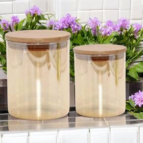 Pote de vidro ambar liso redondo com tampa hermetica de madeira / bambu 750ml e 550ml Pote de vidro ambar liso redondo com tampa hermetica de madeira / bambu 750ml e 550ml