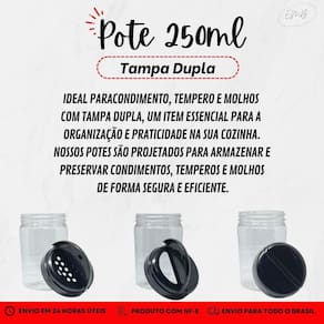 O Pote De Tempero Plástico 250 Gramas Com Tampa Dupla - 5 Unds é um item essencial para a organização e praticidade na sua cozinha. Com capacidade de 250ml, esses potes são projetados para armazenar e preservar condimentos, temperos e molhos com segurança.