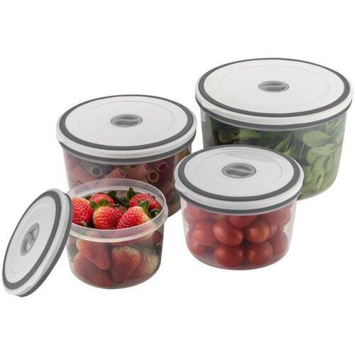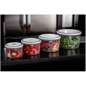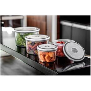 Contém 04 potes plásticos com tampa nas medias e capacidade: - 114x80mm - 550ml. - 133x90mm - 880ml. - 156x101mm - 1,43L. - 182x116mm - 2,3L.