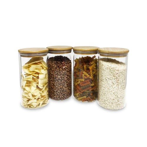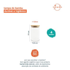 Esse conjunto é composto por 4 peças: 4 Unidades do POTE DE MANTIMENTOS DE 1100ML COM TAMPA DE BAMBU – OIKOS Altura: 18,7 cm Diâmetro: 9,5 cm