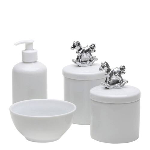 Kit higiene com porcelanas brancas decoradas com cavalinho prata.