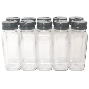 Potes para tempero com tampa dosadora dupla kit 10 potes O kit contém 10 potes vazios de 200ml para temperos especiarias em geral, eles são de plástico de alta resistência contendo também tampa dosadora giratória com 2 níveis .