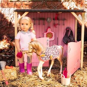 Conheça a encantadora Potrinha Palomino Our Generation, o novo xodó das brincadeiras com bonecas! Com 30 cm de altura, essa adorável potrinha tem pelagem creme, crina e cauda loiras supermacias que podem ser escovadas e estilizadas. Acompanha acessórios de cuidados como manta floral, balde, escova, esponja, luva de limpeza, shampoo, spray e cabresto com guia tudo para garantir passeios e momentos de cuidado cheios de carinho e imaginação.