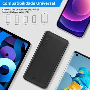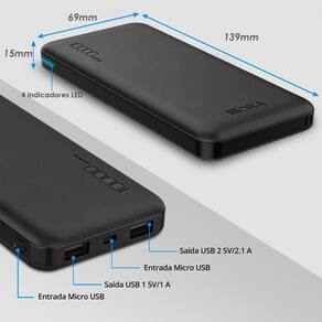 Capacidade de 10.000mAh, 2 entradas USB, Carregamento rápido, Segurança anti-incêndio V0, Visor LED.Tipo