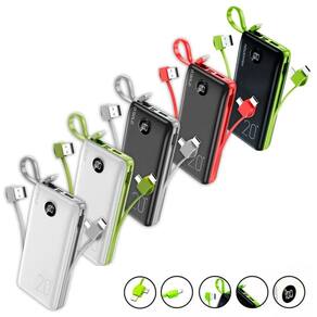 Power Bank com 3 cabos integrados (USB Tipo-C, Lightning, Micro USB), display digital em LED indicador de bateria, mecanismo inteligente de controle de carga e descarga.Tipo