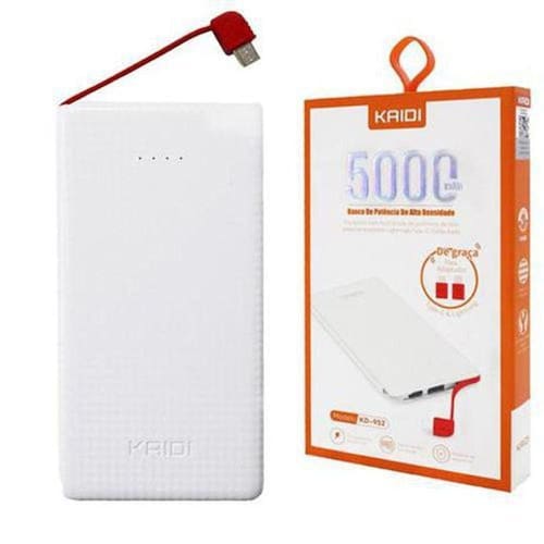 Possui design elegante e moderno, no formato slim, cabendo facilmente em bolsos e compartimentos pequenos. Usa bateria de polímero de lítio para torna-lo mais fino e de alta performance. construído em proteção da bateria IC para evitar o excesso de carga, sobre o descarregamento e curto-circuito. Possui cabo embutido e 2 adaptadores um type-c e outro lightning. Especificações:- Marca: Kaidi- Modelo: KD-952- Material: Plástico de alta qualidade- Produto: Power Bank- Bateria: Polímero de Litio- Capacidade: 5.000mah- Capacidade da Bateria Interna: 3.7v/5000mah 18.5wh- Entrada: Micro USB Dc 5v 2a- Saída Nominal: =3160mAh =15.8wh- Dupla Saída Usb: 5v 2.1a, 5v 2.1a- Saida: DC5V 2.1A (built in cable) / DC5V 2.1A (usb port)- Duração de Bateria em Standby: 5000h- Ciclo de Vida: 500 Recargas (1 Recarga = De 0 A 100)- Temperatura em Trabalho: 0C to 40C- Tempo Carregamento do Power Bank: 3-5 horas- Indicador de carga em LEDs.- Chip inteligente de reconhecimento, detecta automaticamente a tensão.- Tecnologia pass through charging, pode carregar seus dispositivos e ser recarregado ao mesmo tempo. Conteúdo da Embalagem:- Carregador Portatil Power Bank 5000mAH Kaidi KD-952 Original- Cabo micro USB (v8)- Adaptador Micro usb X Tipo C- Adaptador Micro usb X lightning Marca: Atacado25