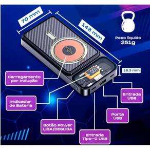 Com um design elegante na cor preta, este power bank é leve e fácil de transportar, cabendo perfeitamente na sua bolsa ou mochila.