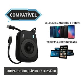 Power Bank compacto com design de minicâmera, capacidade de 10.000mAh, entrada Tipo-C, duas saídas (Lightning e Tipo-C), carregamento rápido de até 22.5W, material ABS + PC retardante de chamas, proteção de múltiplos circuitos, visor LED indicador e chip de reconhecimento de tensão inteligente. Possui carregamento por indução.Tipo
